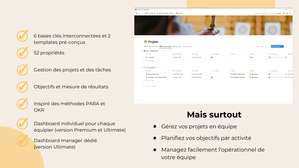 Ce template vous permet de gérer vos activités quotidiennes de façon structurée et optimisée, en équipe Inspiré de la méthode PARA, vous disposez de 6 bases clés interconnectées :